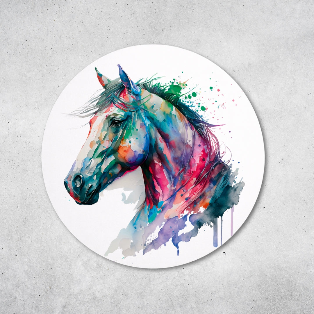 Dieses runde Metallschild zeigt ein kraftvolles Pferd in einem modernen, kunstvollen Stil.
